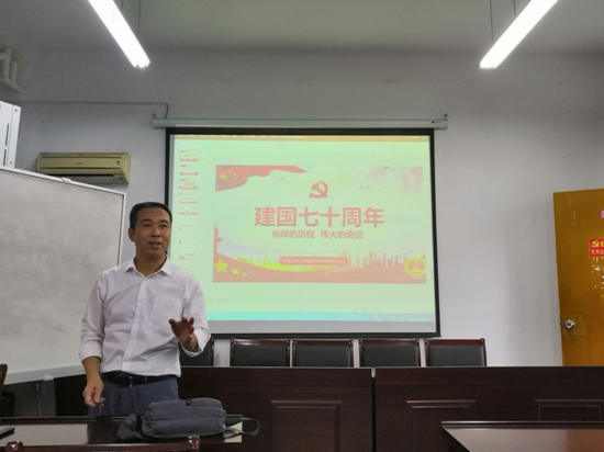 党委书记以“中华人民共和国成立七十周年——光辉的历程伟大的奇迹”为题,结合“不忘初心、牢记使命”主题教育学习调研和学院实际,为全体学生党员讲授了一堂生动的主题党课。