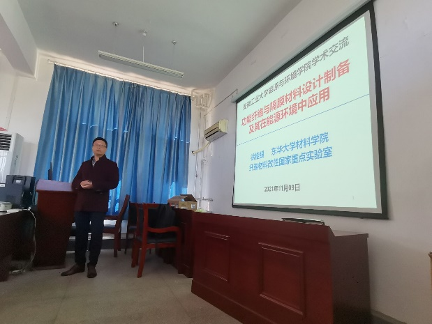 徐桂银教授主要介绍了新能源电池、功能隔膜材料在水处理中的应用、基于智能纤维材料的空气净化装置几个方面的内容。徐教授在报告过程中介绍了新材料在能源与环境领域中的应用,结合亲身经历,向同学们分享了从事科学研究的经验和方法。在互动环节,部分师生结合自己的科研课题,从学科交叉的角度与徐教授进行了热烈探讨,徐教授充分肯定了研究生善于思考的精神,并欢迎有志继续深造的研究生报考东华大学博士研究生。