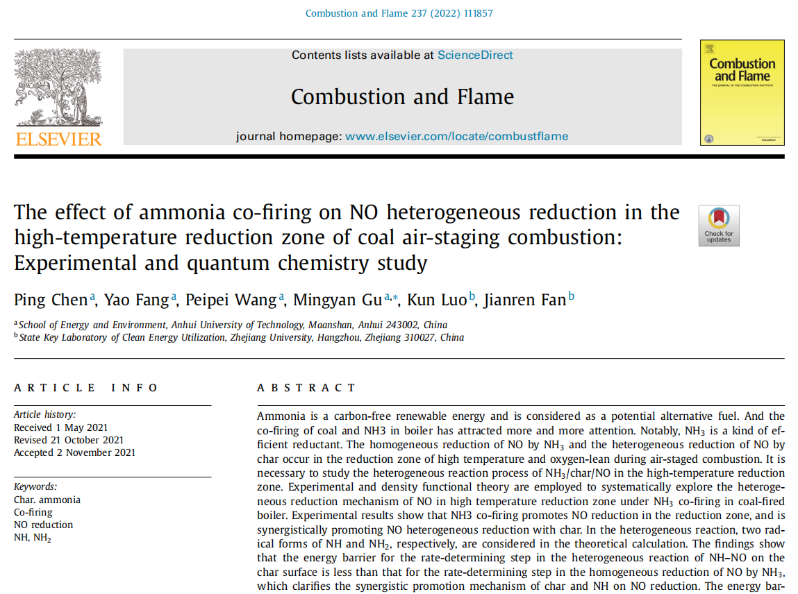 青年教师陈萍在燃烧领域国际权威期刊《Combustion and Flame》上,以第一作者身份发表了题为“The effect of ammonia co-firing on NO heterogeneous reduction in the high-temperature reduction zone of coal air-staging combustion: Experimental and quantum chemistry study”的论文。该论文通讯作者为色情教团