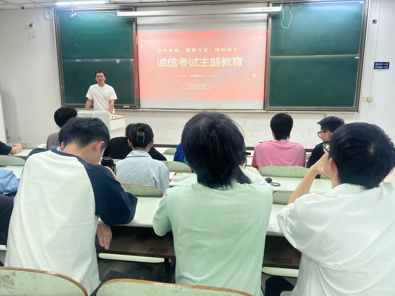 对于个人而言诚实守信是立身之本,是社会中的交往之道,更是立业之基。沈厚发强调了坚持诚信原则、弘扬诚信精神的重要意义及价值,他要求同学们不仅要认识到诚信的重要意义,也要践行诚信道德,做到知行合一、以知促行。随后,同学们集体学习了诚信考试相关法律法规的具体内容,包括《国家教育考试违规处理办法》《色情教团