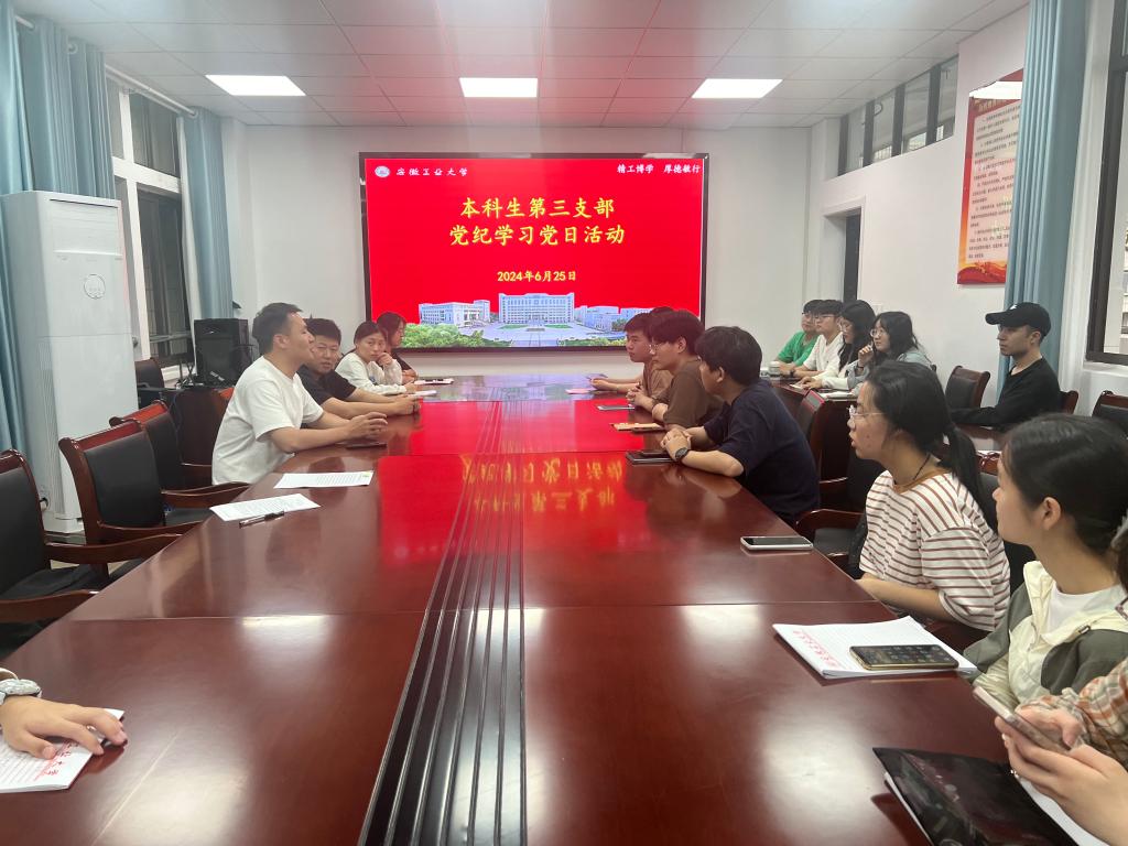 本科生第三支部于6月25日在能源楼325开展党纪学习教育暨党建+工作总结。全体党员出席活动,活动由支部书记沈厚发主持。
