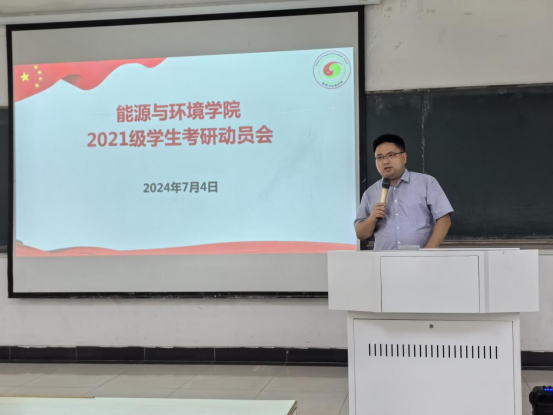 卫军帅作考研再动员宣讲。他深刻分析当前就业形势,明确考研是深化专业知识、提升就业竞争力、实现个人价值的重要途径,希望同学们一要注重立足自身实际,明确考研目标。在充分了解考研形势和考研政策的基础上,量体裁衣,明晰自身定位,锚定考研院校专业;二要注重学习的联系性和系统性,合理规划时间。积极探索高效学习方法,脚踏实地认真备考,绵绵用力,久久为功;三要注重身心健康,保持积极乐观心态。考研复习任务繁重,应合理安排作息时间,保证充足的睡眠和适当的运动,学会调整自己的心态,保持平和、稳定的情绪。卫军帅勉励广大2021级能环学子要明确考研方向,坚定考研信心,全力以赴“一战成硕”。