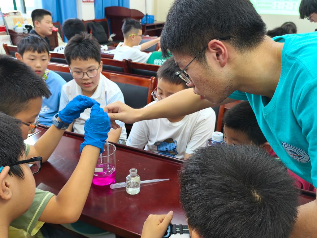 课堂上,实践队员通过沉浸式实验教学点燃孩子们的科学热情:在污水净化实验环节,现场对比清洁水与生活污水差异,演示沉淀法、过滤法操作流程,直观展现水质净化原理;酸碱中和“变色”实验更引发阵阵惊叹,当酚酞溶液在孩子们手中由无色变红再褪色,水的化学奥秘悄然扎根。小学生分组协作完成实验,在动手实践中深化了对节水、护水的认知。