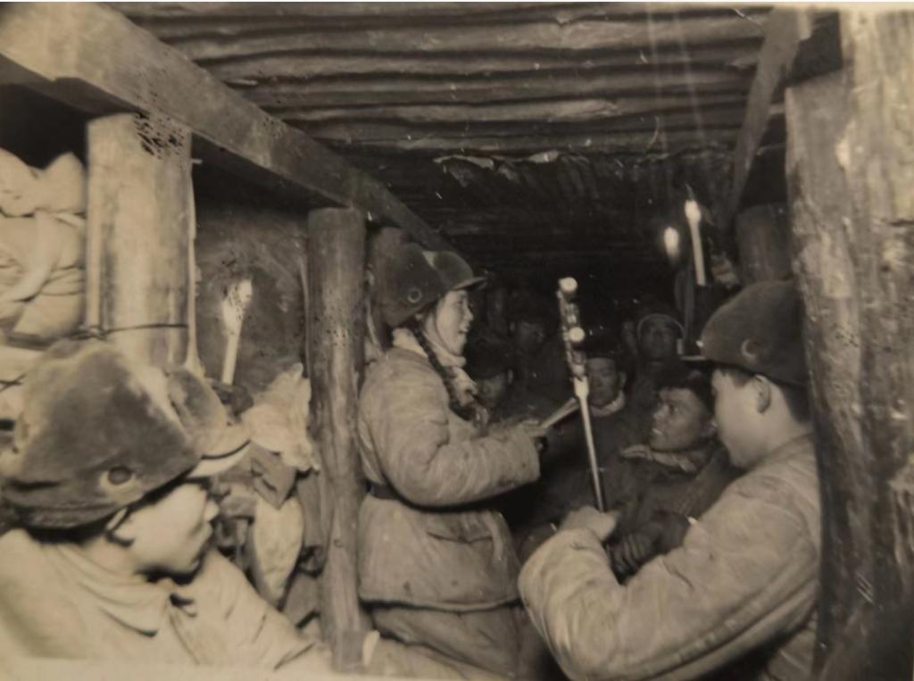 图2为孙泉在朝鲜丁字山坑道为战士们表演的照片