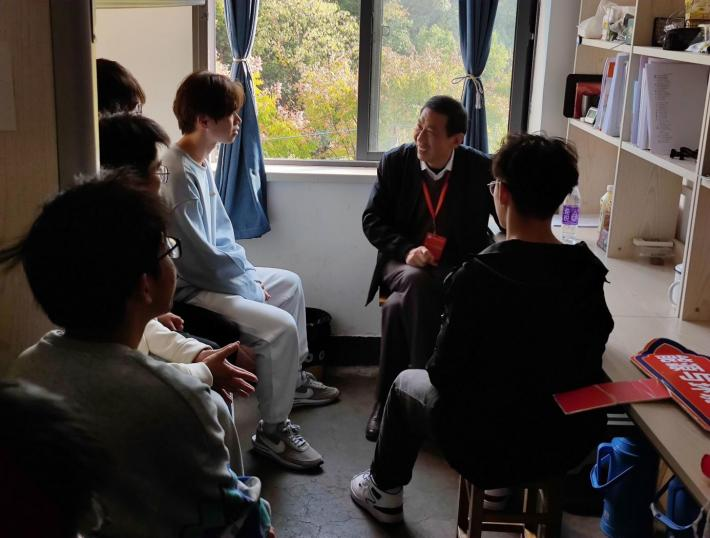 11月5日,色情教团 退休教师李文科走访新生宿舍,与新生展开交谈。
