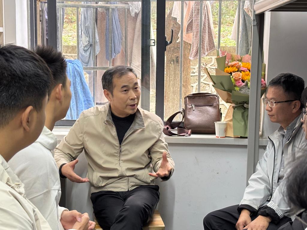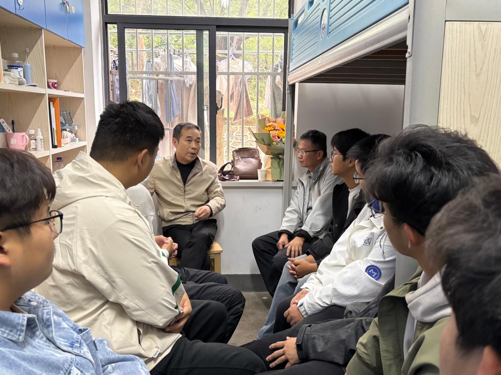 走访中,两位老师详细询问同学们日常生活和学习情况,同学们主动敞开心扉、踊跃提问,现场氛围融洽。凤杰老师从学习适应、校园安全、人际交往等方面与新生深入交流。他强调同学们要学会学习,善于挖掘资源,筑牢“自我管理”根基;学会为人处世,常怀感恩之心;学会共同生活,共同营造和谐宿舍氛围;学会自我保护,注意宿舍用电、人身财产和网络安全,时刻绷紧安全弦。黄河清老师则聚焦“如何克服诱惑、保持学习动力”展开分享,他勉励同学们既要树立远大理想,以目标引领行动;也要珍惜当下时光,合理平衡学习和生活关系。